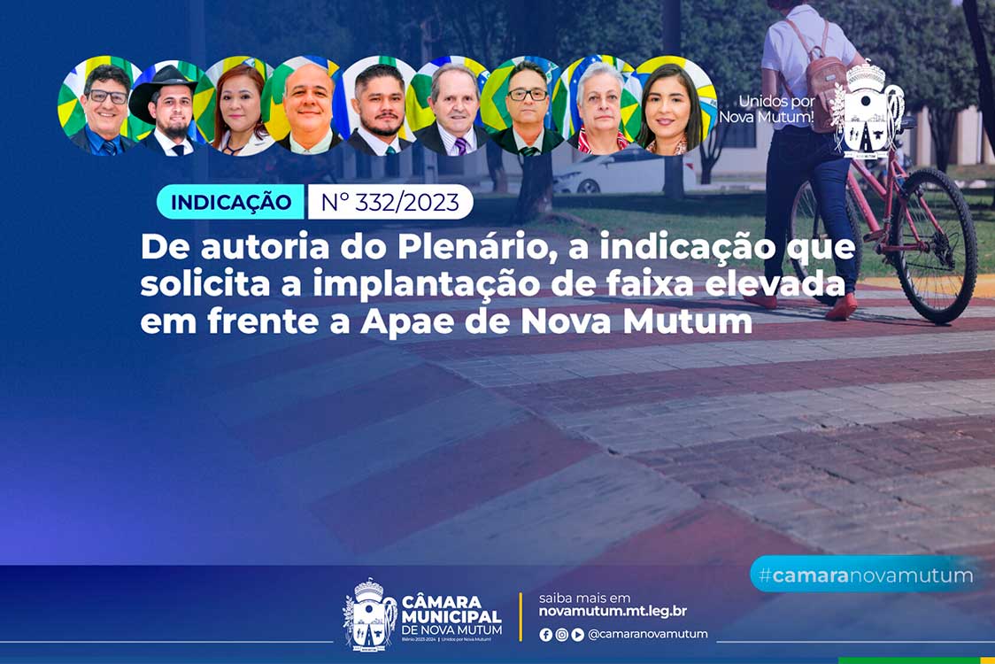De autoria do Plenário da Câmara, a indicação que solicita ao Chefe do Poder Executivo, a necessidade de implantar faixa elevada de pedestre na rua das Primaveras, em frente a Associação de Pais e Amigos dos Excepcionais – APAE, no município de Nova Mutum.