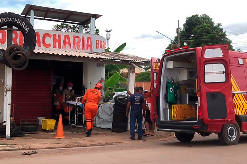 Quando a equipe chegou, encontrou a vítima caída no chão da borracharia. Corpo de Bombeiros esteve na cena do crime, fez o resgate e encaminhou a vítima para uma unidade de saúde.