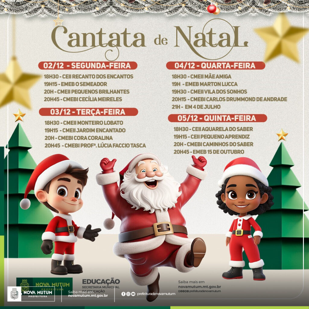 Esta é a 3ª edição da Cantata Escolar de Natal um símbolo do amor e da celebração da vida, refletindo o verdadeiro significado do Natal. Ao longo destes quatro dias, as famílias poderão acompanhar as apresentações natalinas dos alunos da rede municipal, desde a Educação Infantil até o 5º ano. Cada dia trará uma nova surpresa, com cada unidade escolar apresentando sua própria interpretação única desta temporada alegre.