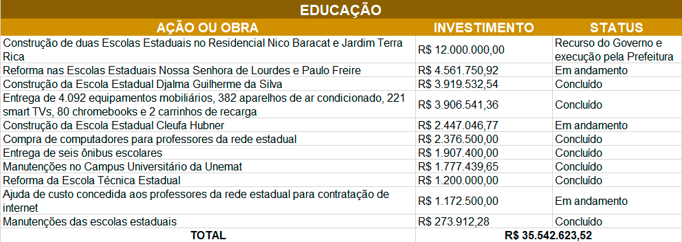 Já na Educação, um dos principais investimentos foi a construção da Escola Estadual Djalma Guilherme da Silva e entrega de 382 aparelhos de ar-condicionado, 221 Smart TVs e 80 chromebooks. O Estado ainda constrói outras duas escolas estaduais no Residencial Nico Baracat e Jardim Terra Rica, em parceria com a Prefeitura Municipal. Para essas ações são mais de R$ 19,8 milhões.
