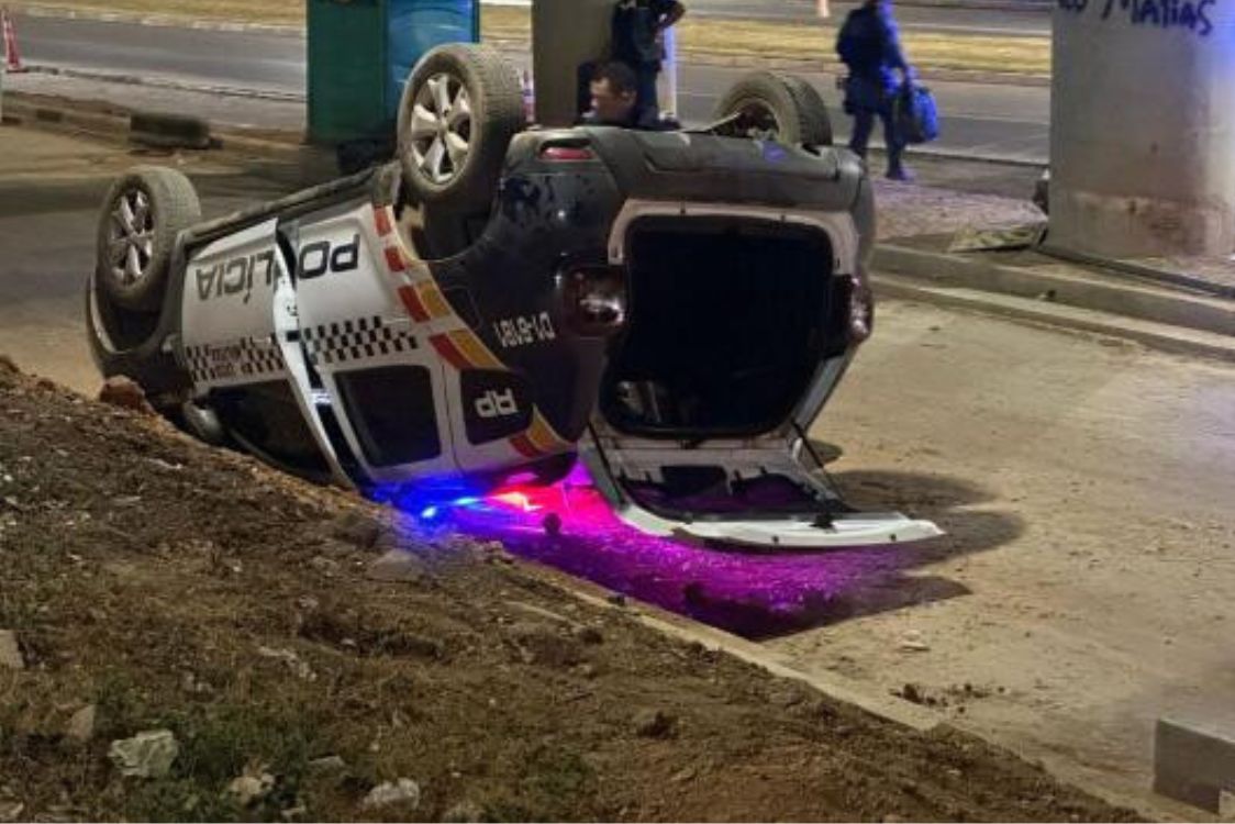 Viatura da Polícia Militar capotou ao desviar de uma moto, durante uma ocorrência, na noite de quarta-feira (7), na avenida da FEB, em Várzea Grande. Apesar do susto, ninguém ficou ferido. O prejuízo foi material.
