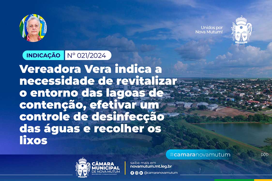 Vereadora Vera Grodzicki indica ao Poder Executivo, prefeito Leandro Félix, a necessidade de realizar a revitalização do entorno das lagoas de contenção, bem como efetivar um controle rígido e constante de desinfecção das águas e recolher o lixo que ali acumula, no município de Nova Mutum.
