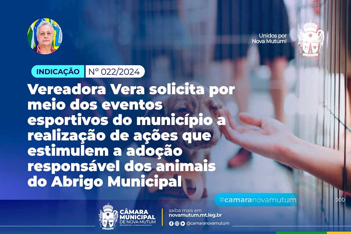 É de autoria da vereadora Vera Grodzicki a indicação que solicita ao Poder Executivo, por ocasião dos eventos esportivos do município, a necessidade de estimular a adoção responsável dos animais do Abrigo Municipal, através de ações que seriam representadas por faixas alusivas, informações dos locutores e principalmente a entrada dos atletas com animais do abrigo, no município de Nova Mutum.