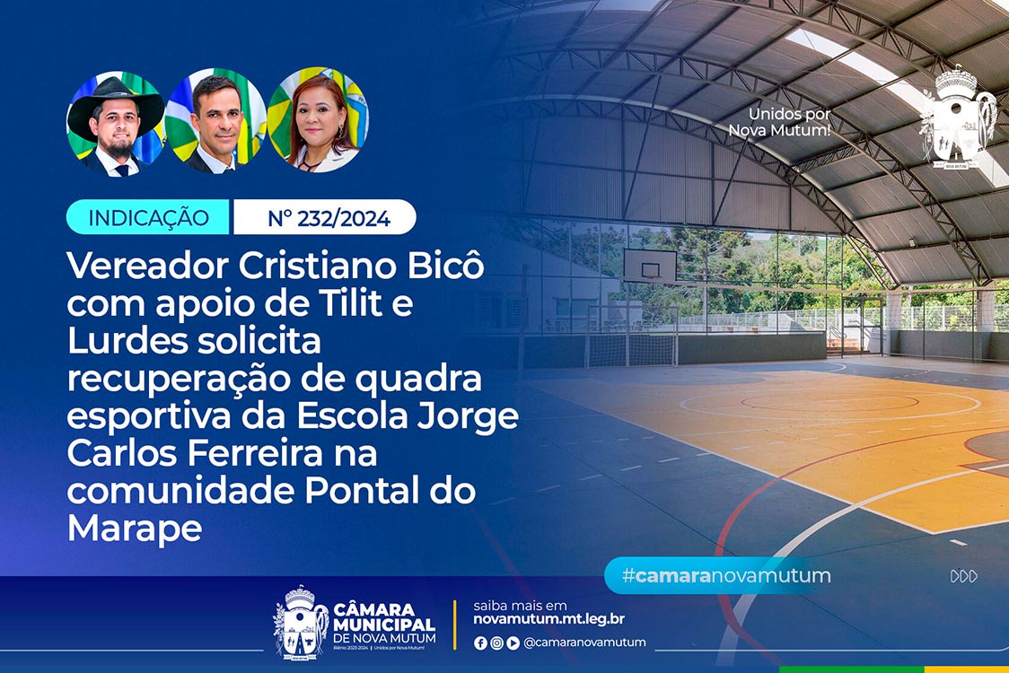 De autoria do parlamentar Cristiano Alves de Oliveira, e apresentado em coautoria com os vereadores Elenilson Tavares de Lima e Lurdes Costa Marques, um pedido encaminhado ao prefeito Leandro Félix, por meio da solicitação de nº 232/2024, dispõe sobre a necessidade de recuperar o dano causado pelo vendaval na quadra de esporte da Escola Jorge Carlos Ferreira, na comunidade Pontal do Marape, no município de Nova Mutum.