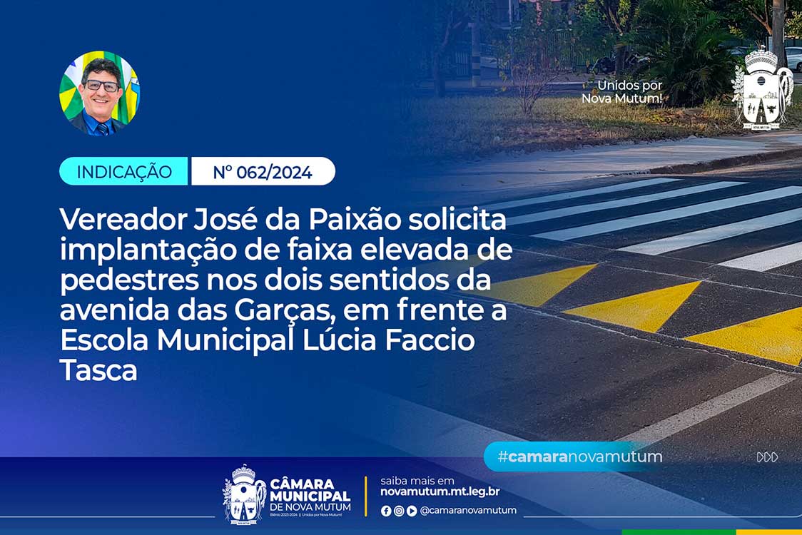 Um pedido apresentado pelo presidente José da Paixão e reforçado na 6ª Sessão Ordinária, tem como objetivo a implantação de faixa elevada de pedestres nos dois sentidos da av. das Garças, em frente à Escola Municipal Lucia Faccio Tasca para melhor locomoção e segurança dos alunos.