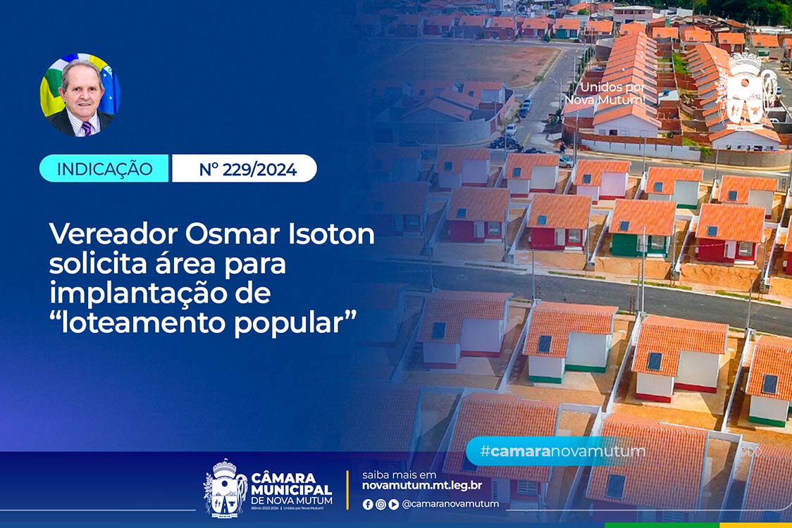 De autoria do parlamentar Osmar Isoton, um pedido encaminhado ao prefeito Leandro Félix, por meio da solicitação de nº 229/2024, dispõe sobre a necessidade da aquisição de uma área de 200 a 300 ha de terras, para a implantação de um loteamento popular, a ser implantado nos moldes do loteamento industrial Marcos Pinardi de Moraes, no Município de Nova Mutum.