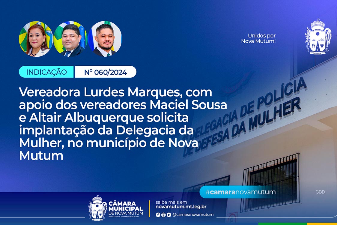 Em justificativa ao pedido, os parlamentares explicam que em Nova Mutum ainda não há Delegacia da Mulher, e a indicação tem a finalidade de ser este órgão de apoio para este público, que no município representa aproximadamente 50% da população.