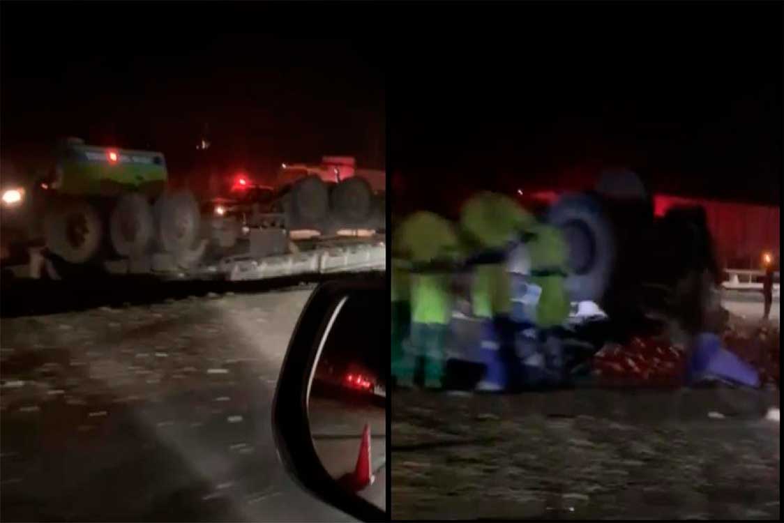 Quando o socorro chegou o condutor já estava sem vida. Carreta caiu no canteiro central e parte da carga estava sobre a pista de rolamento. Ainda não se sabe a dinâmica do acidente.